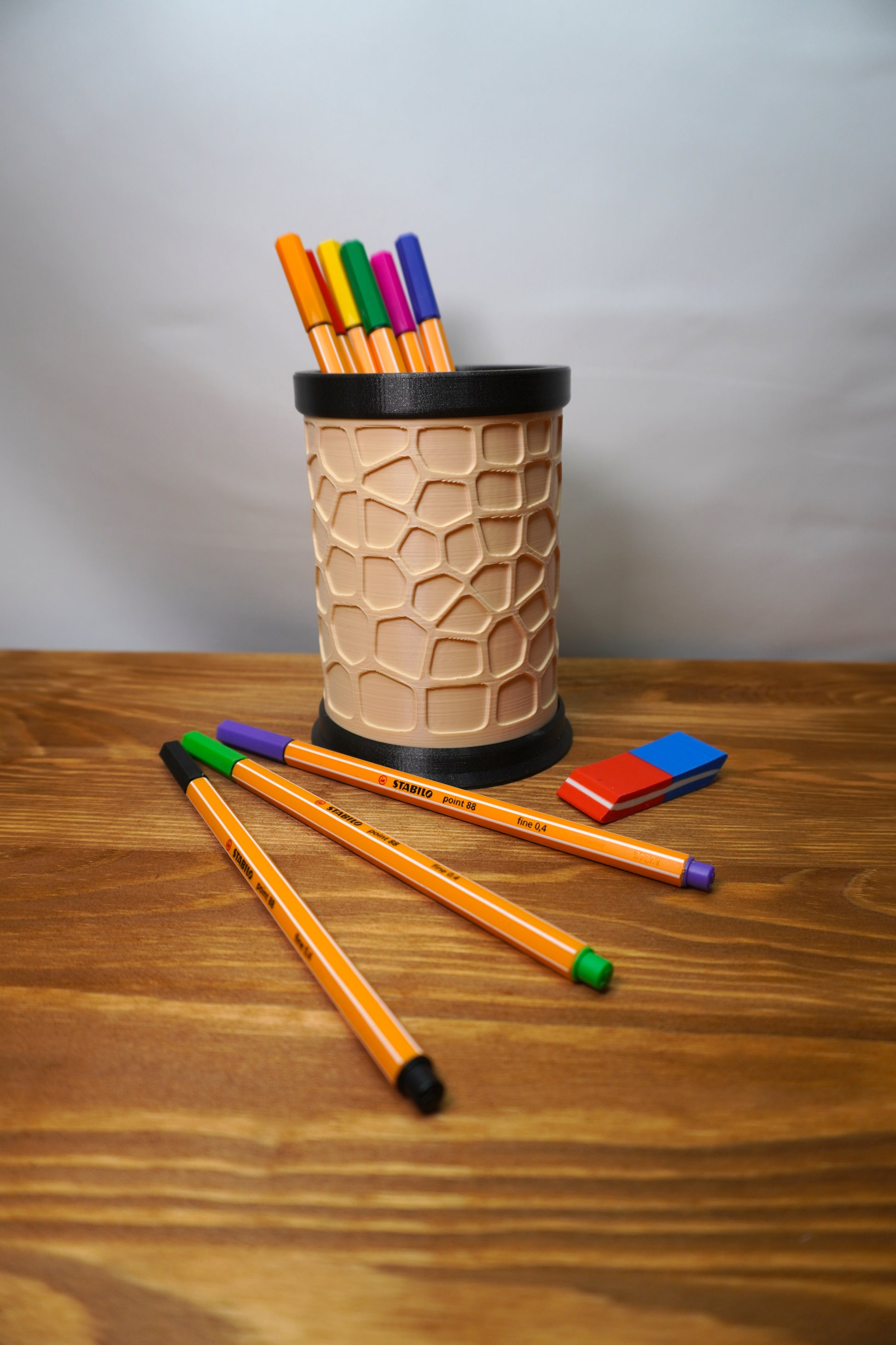 Dieser Stifthalter ist nicht nur ein praktisches Accessoire für deinen Schreibtisch, sondern auch ein echter Blickfang. Er bietet ausreichend Platz für deine Stifte, Marker und andere Utensilien und sorgt so für Ordnung und Übersicht auf deinem Arbeitsplatz.